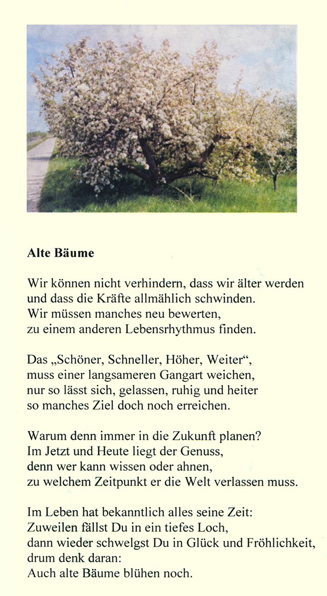 Im letzten Frühjahr habe ich bei uns in der Pfalz einer Freundin die Apfelbaumblüte gezeigt und da fiel mir auf, dass besonders viele alte Bäume eine verschwenderische Blüte zeigten. Und so ist das folgende Gedicht entstanden.